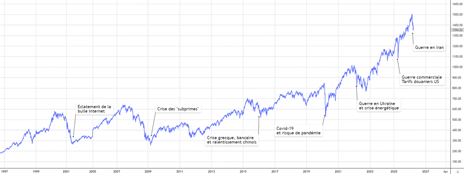 Sans minimiser la situation actuelle, il est également bon de se rappeler la performance des marchés actions sur longue période. Nous avons traversé d’autres tempêtes au cours des dernières années (éclatement de la bulle internet 2001, crise des « subprimes » 2008, crise grecque 2015, Covid-19 2020, guerre en Ukraine 2022, guerre commerciale 2025) et nous en affronterons d’autres à l’avenir.